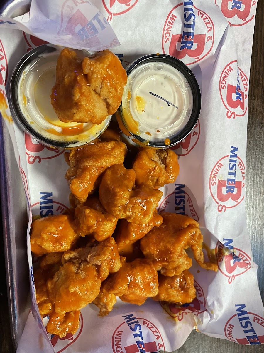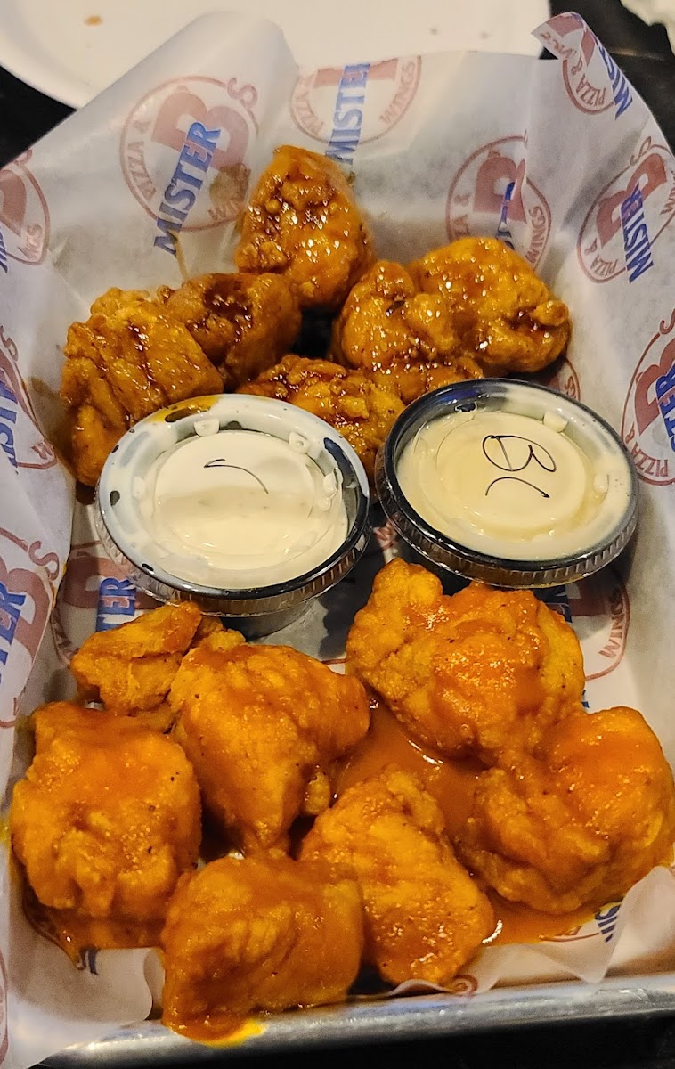 I order the Lunch Special: boneless Hurricane wings and the one-topping pizza mini, and it's always tasty! The servers and staff are personable and friendly making the atmosphere welcoming. I have suggested Mister B's several times to friends and colleagues looking for some good wings and pizza. You can never go wrong ordering from Mister B's!!! Oh, and the fried mushrooms! (chef's kiss)